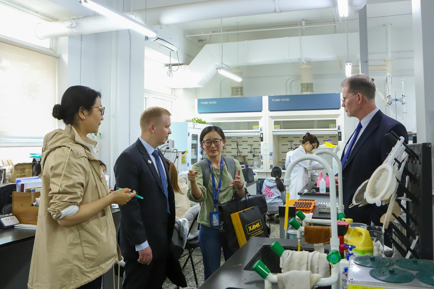 会谈前,代表团一行在食品与健康学院副院长王蓓、国际交流与合作处副处长马雪娇的陪同下参观了学校的实验室设施,了解了我校在食品和轻工方面的相关科研情况。