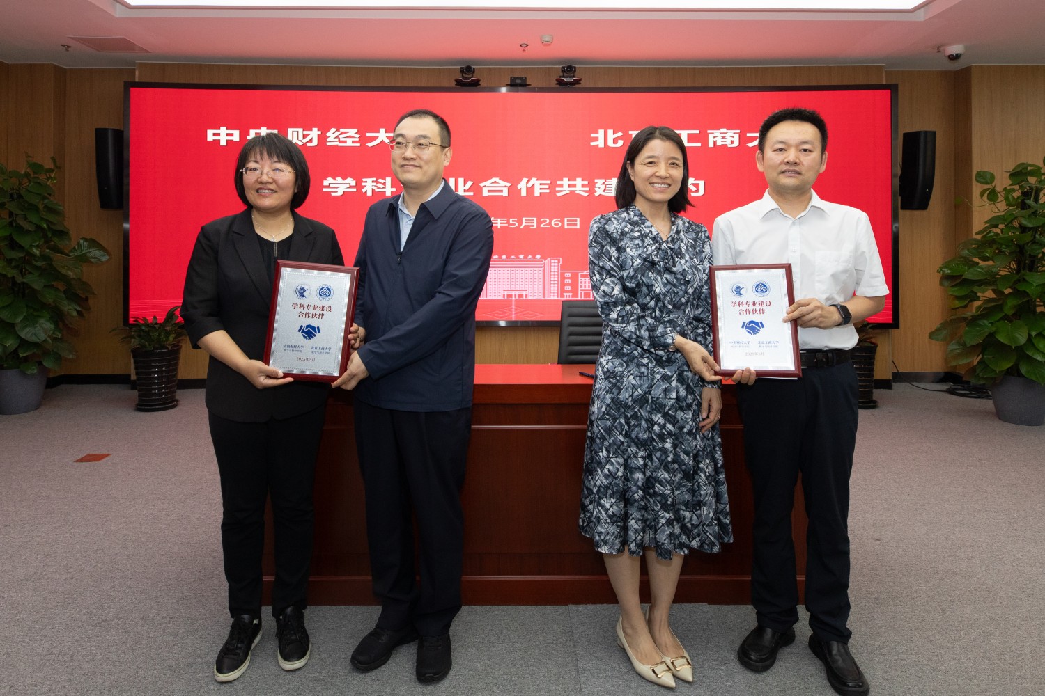 中央财经大学统计与数学学院贾尚晖院长和我校数学与统计学院周艳杰书记签约;中央财经大学李涛副校长和我校刘艳楠副校长为双方颁发签约纪念牌。