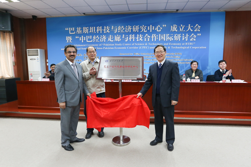 11月30日下午,我校成立“巴基斯坦科技与经济研究中心”并召开“中巴经济走廊与科技合作国际研讨会”。我校党委书记谭向勇、中国科学技术协会国际联络部副部长王庆林和巴基斯坦驻华大使馆参赞松赞·阿巴斯(Shozab Abbas)出席会议并共同为巴基斯坦科技与经济研究中心揭牌。成立大会由国际交流与合作处处长刘影主持。