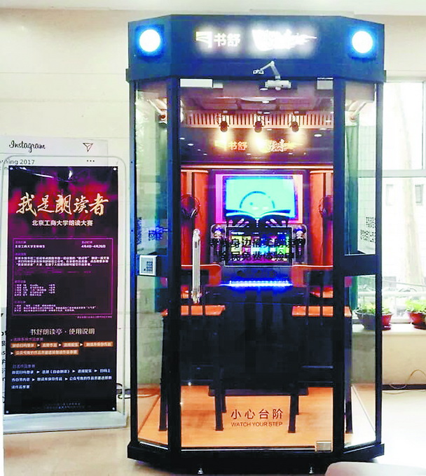 这座朗读亭今年才出现在校园里,立刻成为了最受学生们欢迎的“文化角”。朗读亭受到追捧源于央视《朗读者》的热播,这档最为火热的文化节目掀起全国范围内的一股朗读热潮,很多人重新拿起书本,沉浸在放声朗读的愉悦中。与此同时,节目线下形式的“朗读亭”应运而生,纷纷走进多所大学校园。除了央视官方的朗读亭外,如今还多了书舒、优谷、博看等其它品牌的朗读亭,也同时出现在校园中。
