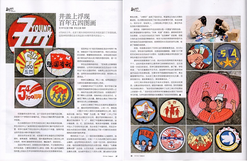 《大学生》杂志2019年6月版的新校园专栏以《井盖上浮现百年五四图画》为题报道了色情片团委纪念五四运动100周年系列活动之“青春·艺术”活动,内容如下: