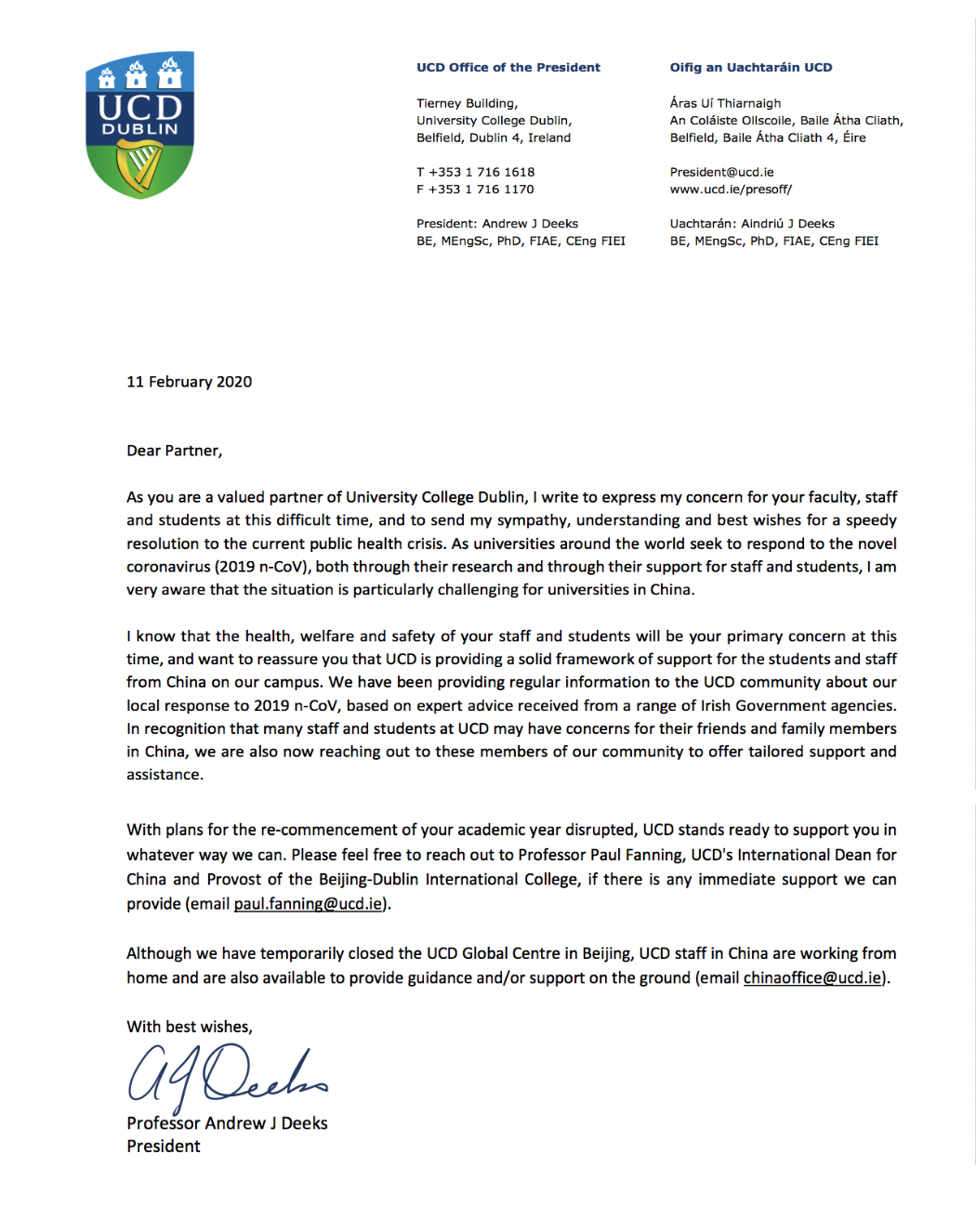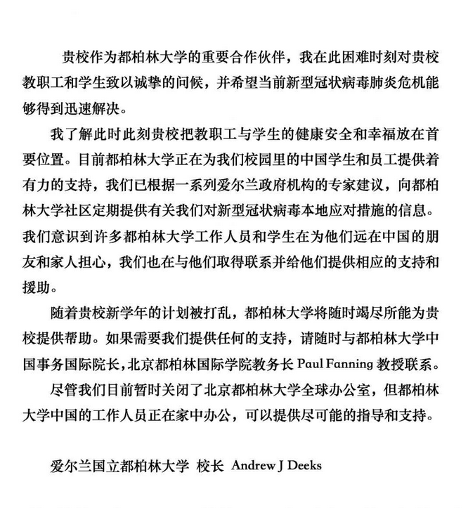 爱尔兰都柏林大学校长 Andrew J Deeks发来问候: