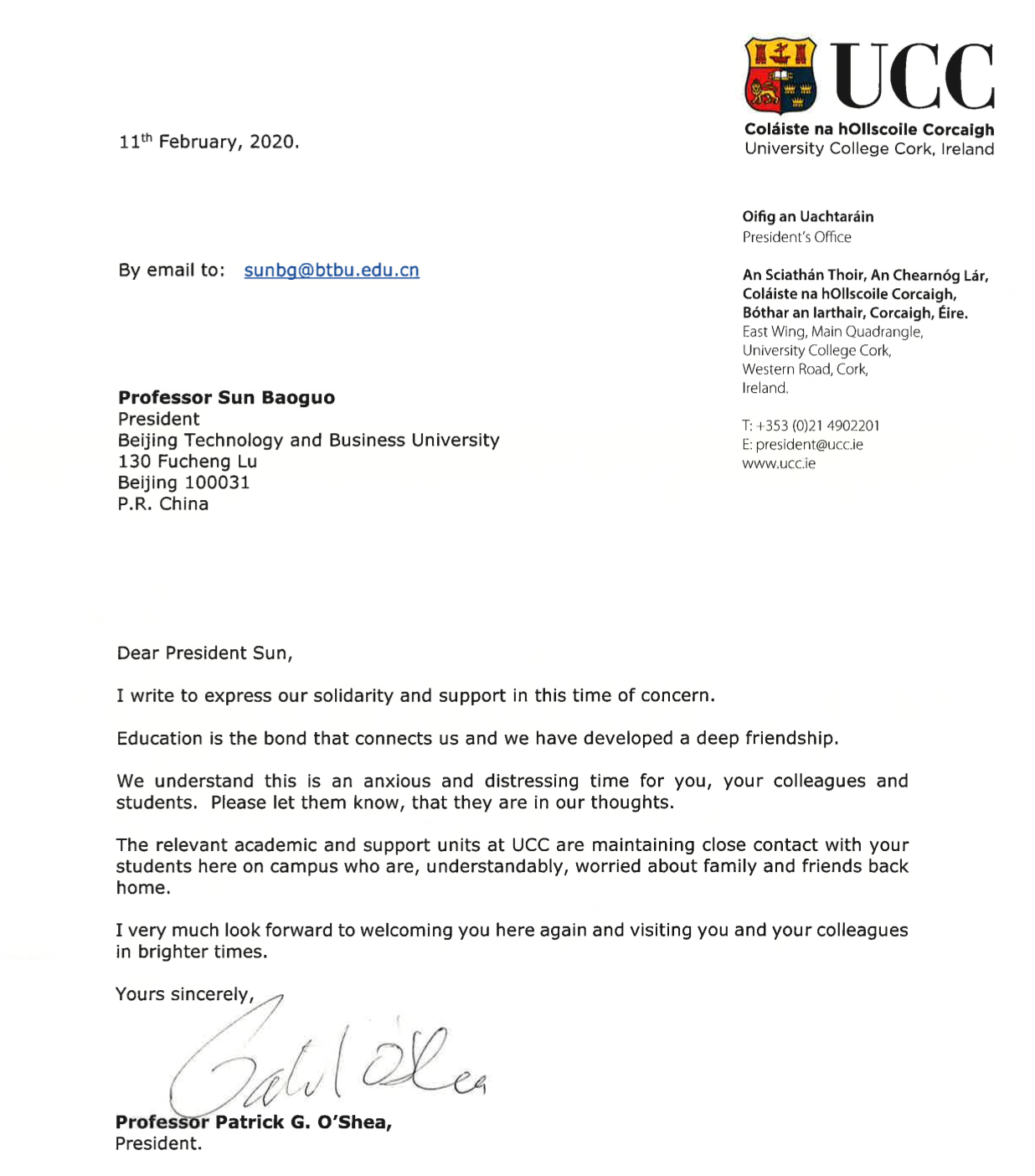 爱尔兰国立考克大学校长Patrick G. O’Shea发来问候: