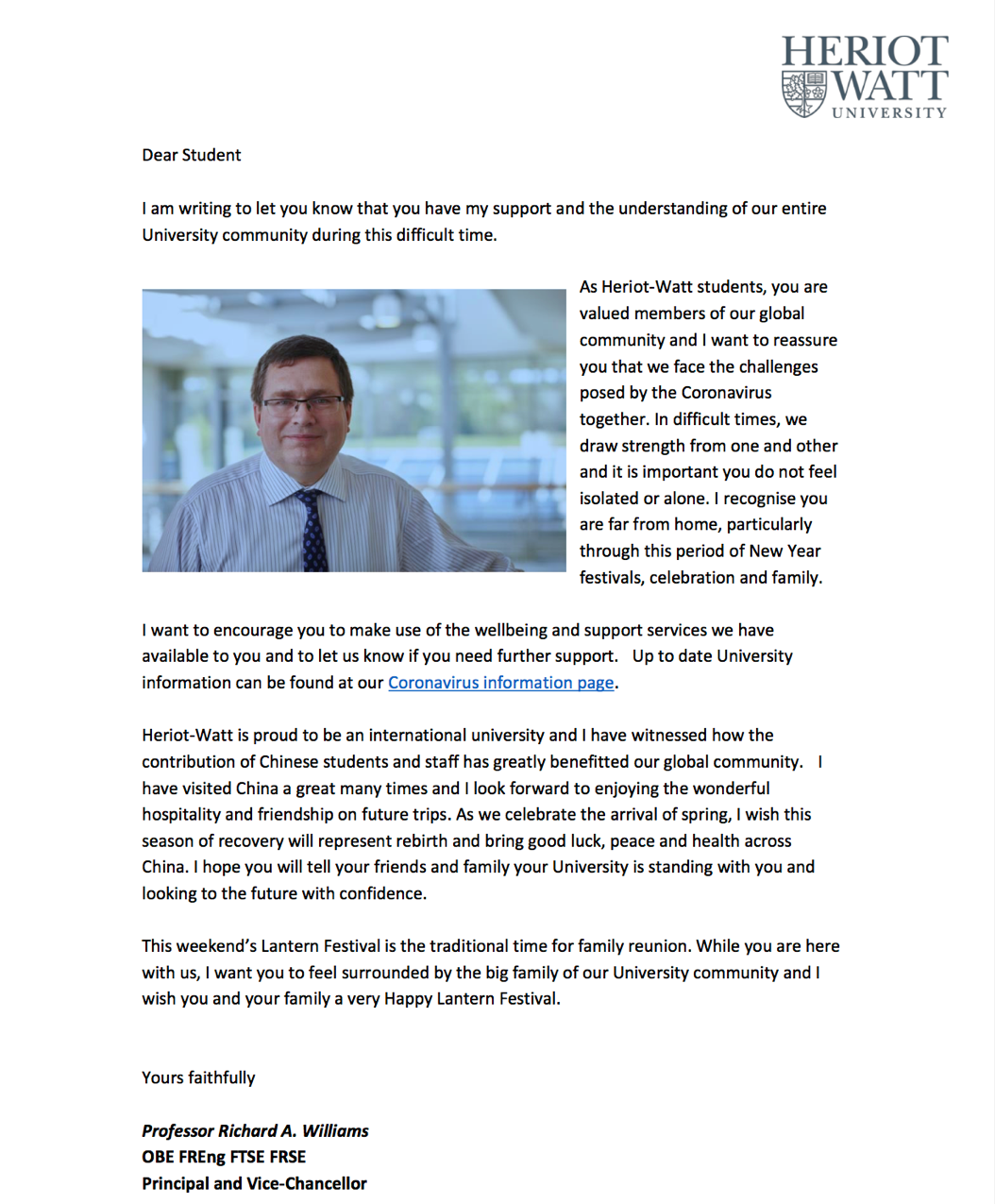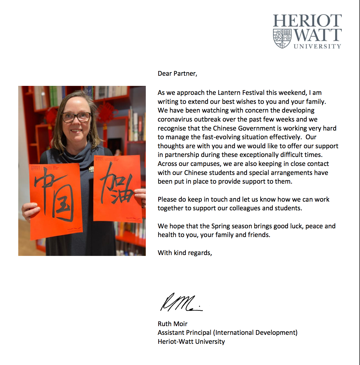 英国赫瑞瓦特大学校长Richard A. Williams和校长助理Ms. Ruth Moir发来问候: