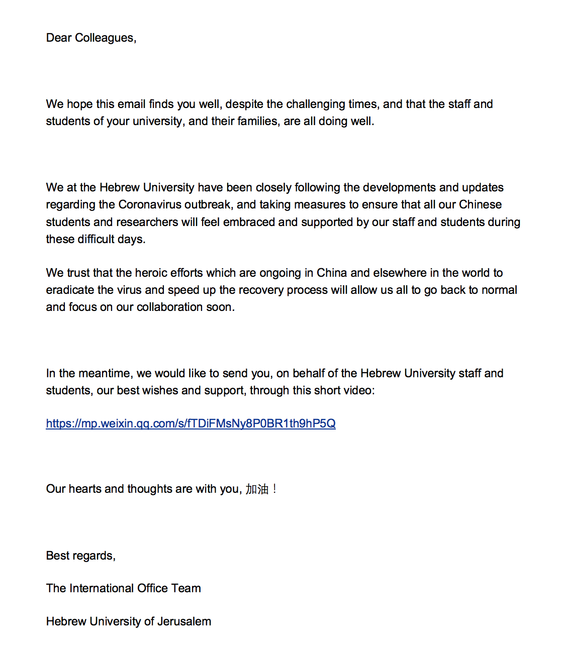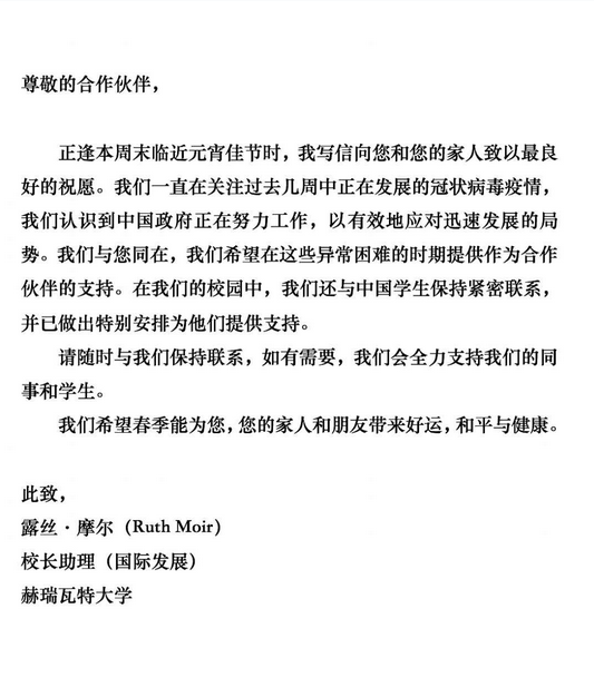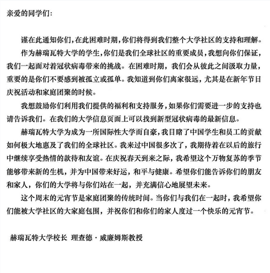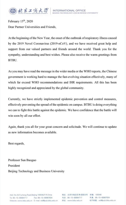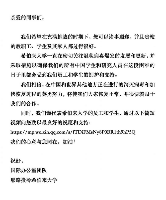 在中国抗击疫情这一困难时期,我以此信表达我校对贵校坚定不移的支持和关切。期待在不久的将来,两校共同前行,走向更美好的未来。