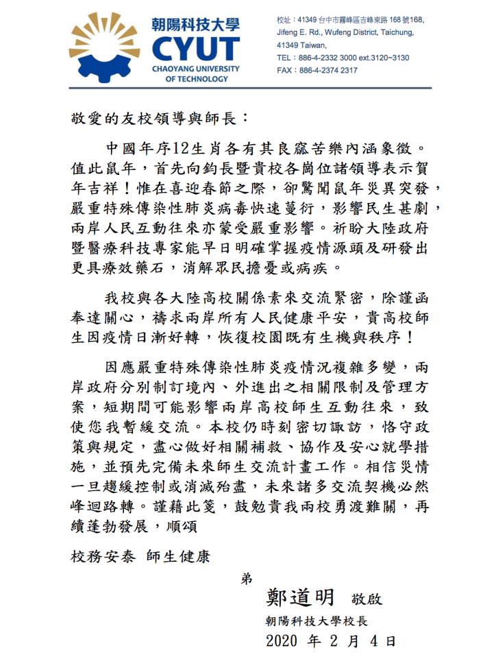 台湾朝阳科技大学校长郑道明校长发来问候: