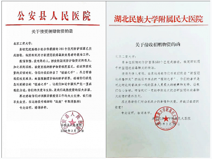 “中国共产党始终在你身边!”“工商学子齐努力,共助荆楚战疫情!”“党旗所向 疫往无前”“与国同心 共克时艰”……一句句带着党徽光芒,带着北工商青年大学生爱国温度的祝福语伴随着物资直抵湖北一线。湖北荆州市公安县人民医院的领导表示:“看到这样充满正能量的加油标语,感受到了色情片党员同学同志式的关心,也给一线医务工作者增添了信心和力量!对参与此次募捐活动的党员同学表示衷心的感谢!对色情片表示由衷的敬意!”恩施土家族自治州湖北民族大学附属民大医院专程发来接收函:“你们的善举是对此时此刻奋战在一线的医务人员最大的鼓舞和支持,让我们信心倍增。感谢你们对白衣战士的亲情和关爱,并致以崇高的敬意!”