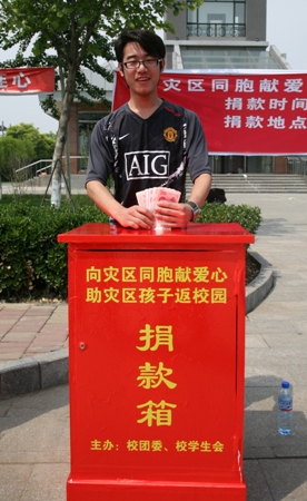 新闻051的吴鑫阳同学捐了600元,她向我们说这是他芙蓉学子的奖学金,这几天每次看新闻都感动地落泪,自己现在不能够到灾区帮助他们,只能够在这里为他们祈祷了。信息学院的团总支书记曹卉老师说:“电器051班班长白爽因为生病住院不能前来捐款,特别让我来帮助她捐款200元”。食堂后勤工作人员由于中午时间在工作,不能过来捐款,但他们已将钱交给了有关的组织部门。外籍老师戴子.苏利文也在捐款箱前停住了脚步捐出了300元钱,当我们的工作人员向他说“thank you ”的时候,他笑着向大家摆手。当我们的记者来到取款机前时,这里也排起了长长的队伍,都是等待取钱捐款的学生。