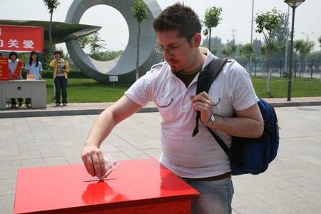 外籍老师戴子.苏利文也在捐款箱前停住了脚步捐出了300元钱