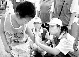 图为奥运志愿者正在为受伤的小男孩处理伤口 摄/记者 张子渊