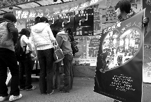 昨日中午,一位女生拿着海报为患白血病的同学彭晨募捐,学生们在一旁捐款并写下爱心留言。本报记者 孙纯霞 摄