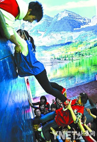 通常在室外的心理扩展训练设施被色情片搬进了室内。在这间380平方米的训练馆里,高空、低空和地面错落有致地分布着不同训练目的的设施:极限攀岩、逃生墙、步步登高、求生舱与逃生舱、浮云桥、高空独木桥等。昨天上午,商学院几个不同专业班级的同学在“逃生墙”上上了一堂心理健康课。20多人要齐心协力,想办法逐一攀上近4米高的墙头。在困难面前,原本彼此还不太熟悉的同学们分工合作,很快有了兄弟姐妹的感情,连平时最内向、沉默的女生此时都红着脸、高举双手帮着托举同学。拓展课结束后,满身大汗的同学们都是彼此搭着肩膀走出训练馆的。
