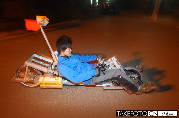 “北晚新视觉网”4月1日发表文章《大学生自制躺着骑的电动车 24块电池最高时速40公里》,报道了我校学生汪希设计制造的“躺骑”电动自行车进行了第一次试车,现将全文转载如下: