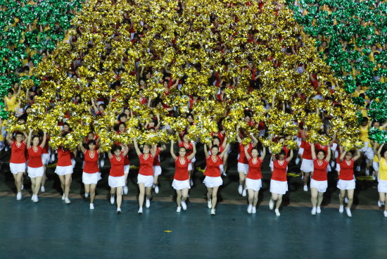 青春的节奏,让朝气蓬勃的大学生伴随着乐声在运动场上绽放出最美的年华。来自商学院、经济学院、艺术与传媒学院、计信学院以及材机学院的1008名大一女生踏着欢快的啦啦操歌曲惊现“舞台”。她们身着红色和黄色制服,高举手花,用各式各样的队形淋漓尽致地展现着“巾帼不让须眉”的气魄。长久的期盼在此刻化作了自信的笑容洋溢在每一位同学的脸上,她们用年轻人的青春蓬勃绘出了一幅又一幅壮美的画卷:“小飞机”、“2013”、“花团锦簇”不断地展现在观众的视野中。指导教师王立红说,团体操的训练让同学们都参与到了体育锻炼中,看到大家这样辛苦训练的成果在此刻展现,我们真正做到了为自己加油。