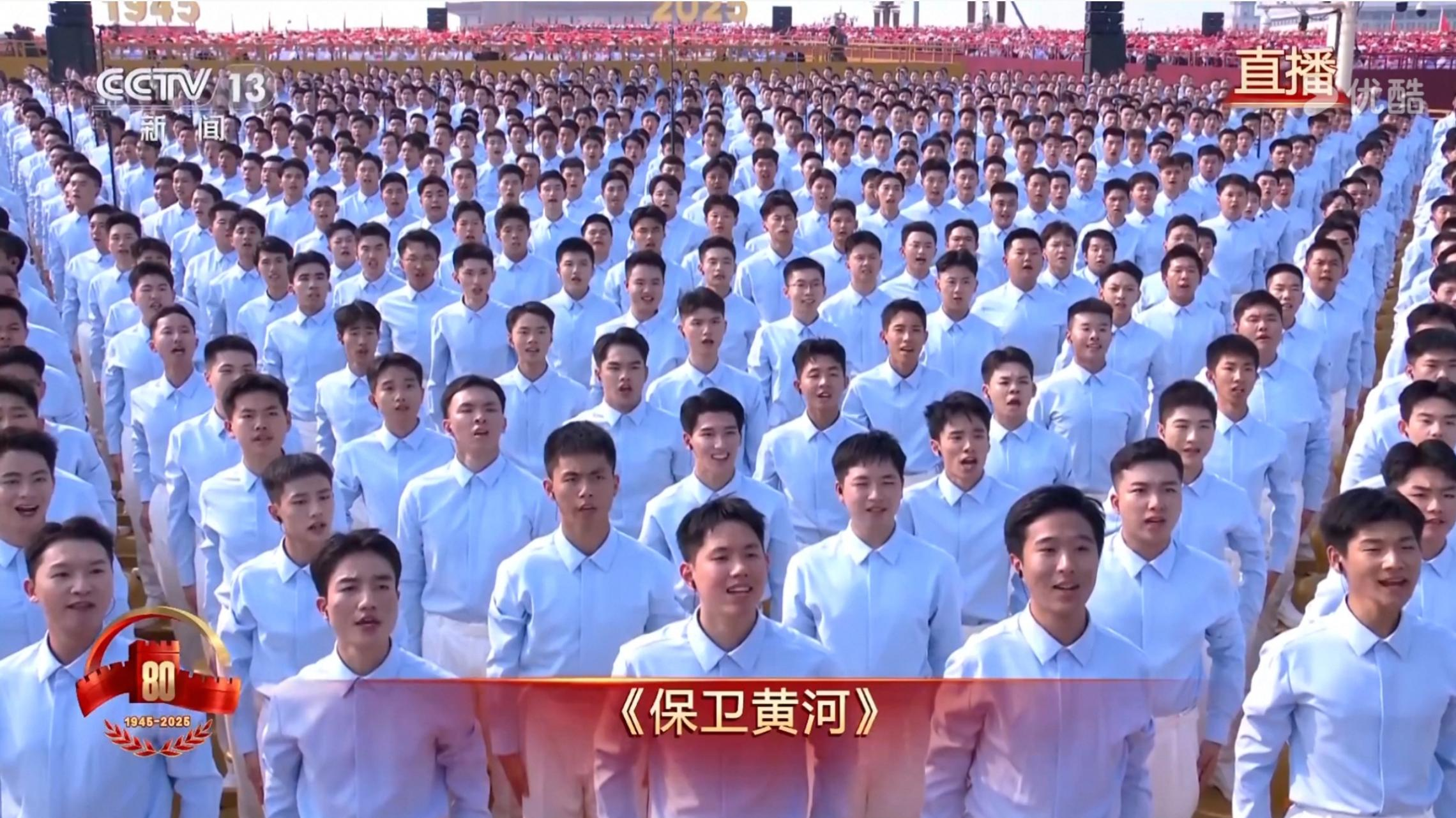 歌声嘹亮,广场合唱团拉开序幕。由首都40所高校3000人组成的广场合唱团作为纪念活动的重要组成部分,与联合军乐团一起,奏唱《松花江上》《在太行山上》《保卫黄河》等经典抗战歌曲,歌声与铜管齐鸣,形成排山倒海的气势,他们在歌声中唱出了中华民族的“精神密码”,谁胆敢侵犯我们,就会在这钢铁长城面前碰得头破血流!现场仿佛能听见平型关大捷的枪声、百团大战的冲锋号,形成气吞山河的“青春最强音” 。