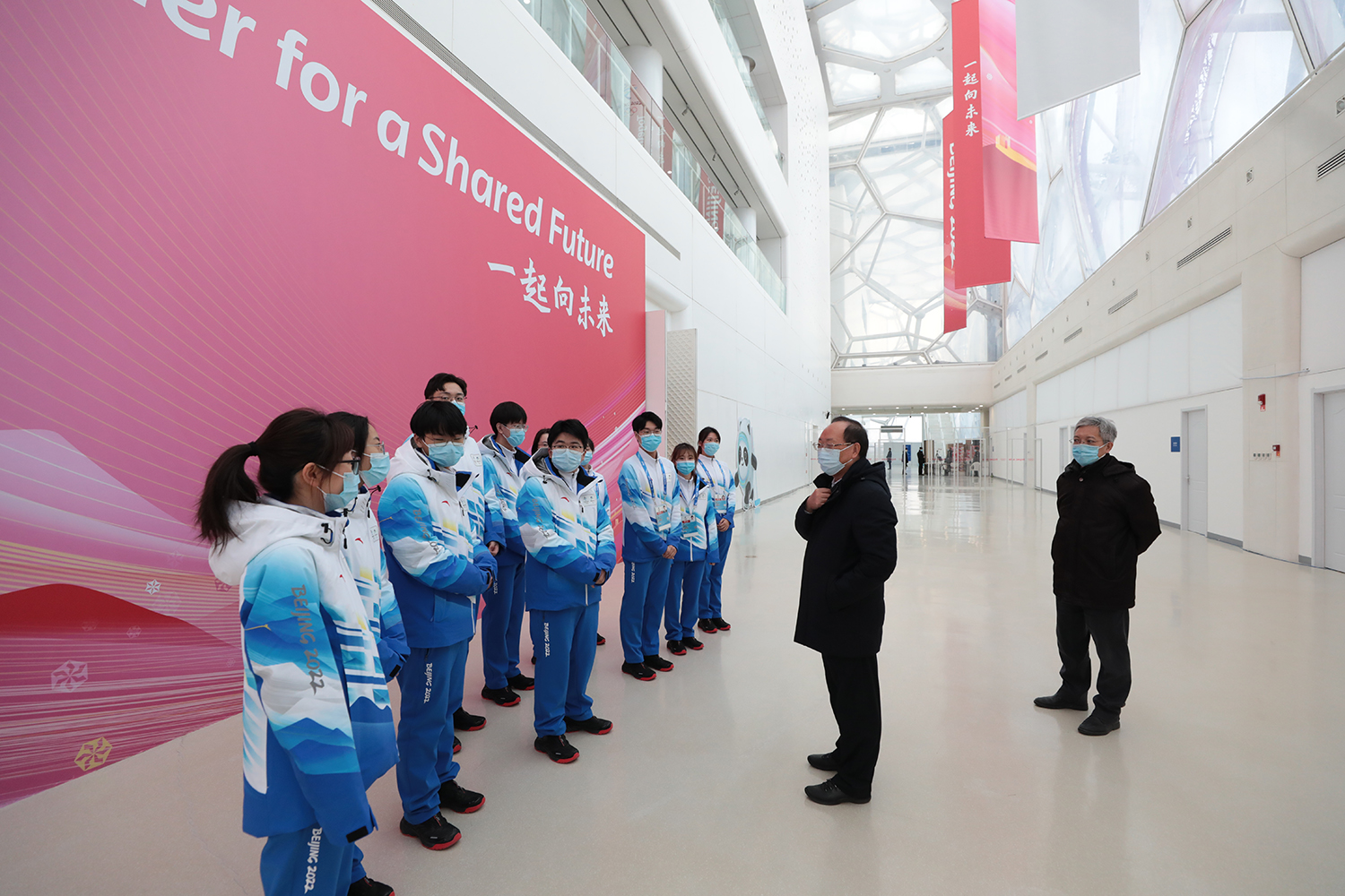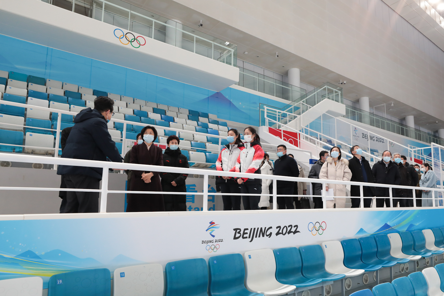 孙梅君部长一行参观了国家游泳中心比赛大厅,场馆主任张杰从场馆水冰转换、志愿者基本情况和防疫三个方面做了重点介绍,孙梅君部长与我校在现场服务的志愿者进行了互动。
