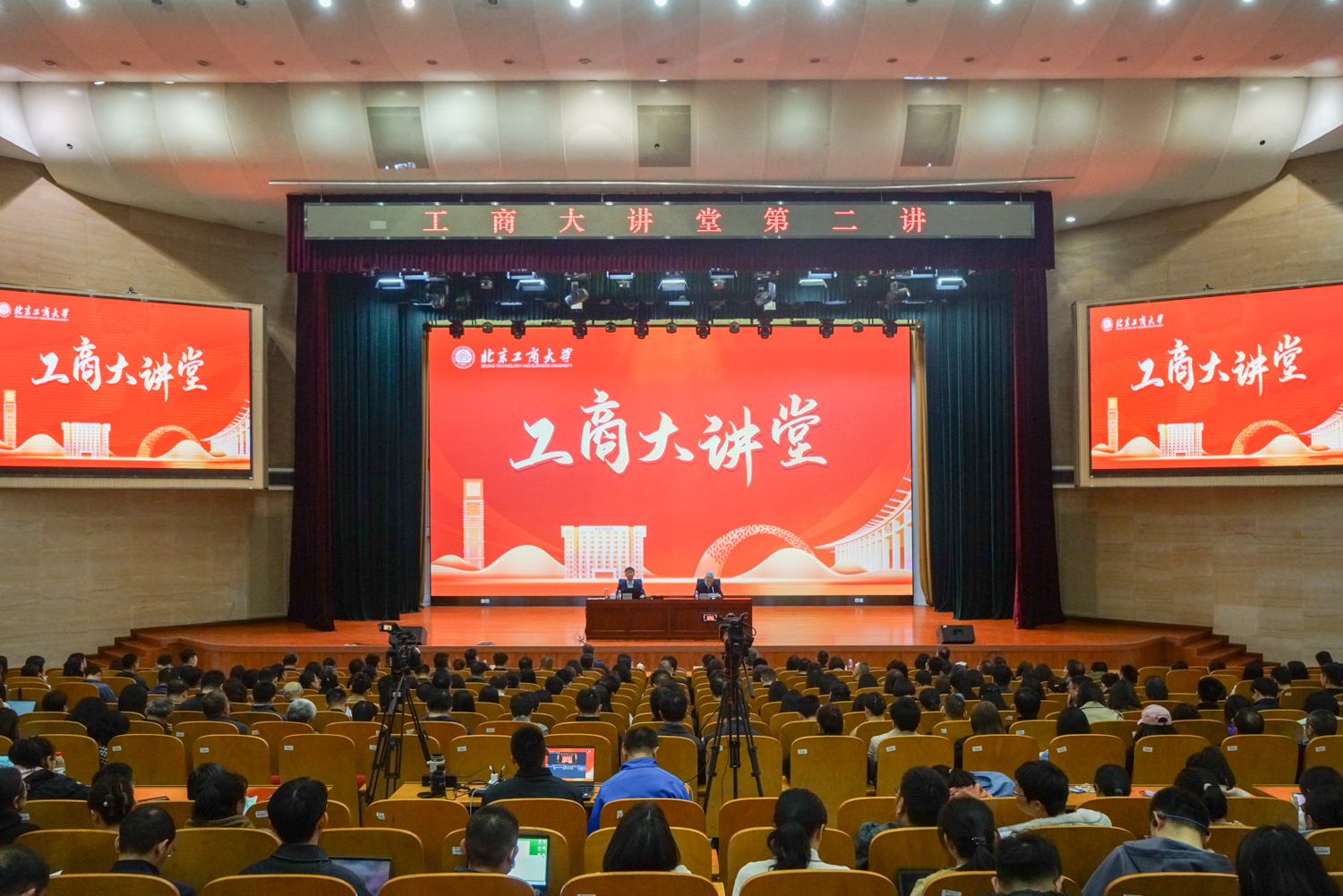 4月2日,“工商大讲堂”第二讲在良乡主校区开讲。学校党委副书记、校长郭建华以《坚持“工商一体化”理念,走好北工商特色发展道路》为题,全面解读我校“工商一体化”理念和“双一流”学科创建思路。校领导李中奇、郑文红、毛新述、寇红江、邓祥征、刘艳楠与全体中层干部、教职工代表近1000人在主会场聆听讲座,全体教职工在分会场线上观看。学校党委副书记李中奇主持讲座。