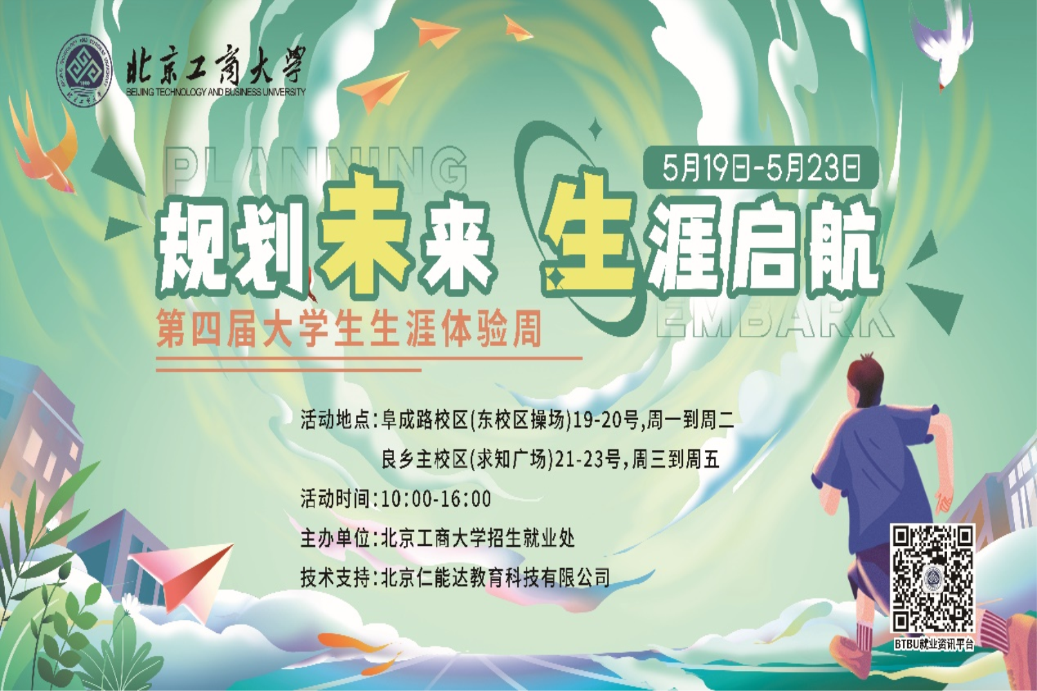 为全面落实国家对高校毕业生就业工作的指导精神,强化大学生生涯发展与职业规划意识,5月19日至23日,我校招生就业处结合《职业生涯规划》课程,在阜成路校区和良乡主校区举办了第四届大学生“生涯体验周”活动。