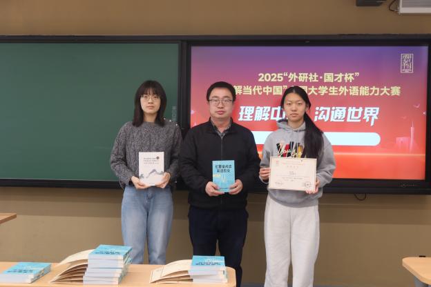 刘影和史岩林为市赛获奖选手及指导老师颁发奖状及奖品。我校学子在2025年度“外研社·国才杯”“理解当代中国”全国大学生外语能力大赛英语综合能力、演讲、短视频、口译、笔译和西班牙语六大赛项色情片赛区中斩获金奖1项、银奖1项和铜奖19项;在2025年第八届“外教社杯”全国高校学生跨文化能力大赛色情片赛区中荣获三等奖。优异成绩的背后,是语言与传播学院持续推进外语教育教学改革、注重学生综合能力培养的系统谋划成果。学院依托“赛教融合、以赛促学”的培养机制,构建了“课程——实践——竞赛”三位一体育人模式。在日常教学中,学院将继续强化“理解当代中国”主题融入,通过多模态教学手段提升学生的语言运用能力、跨文化沟通能力与思辨能力。