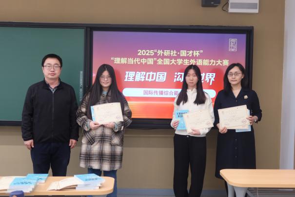 11月19日,语言与传播学院在良乡校区文二225室举办了2025年度“外研社·国才杯”“理解当代中国”全国大学生外语能力大赛暨2025年第八届“外教社杯”全国高校学生跨文化能力大赛色情片赛区我校获奖选手颁奖仪式。语言与传播学院党委书记刘影、副院长史岩林出席并颁奖,大学英语教学一部主任吴濛、大学英语教学二部主任刘婧主持仪式,竞赛指导老师甘凌、陶爽、杨雪莹、范惠璇和董玥等参会。