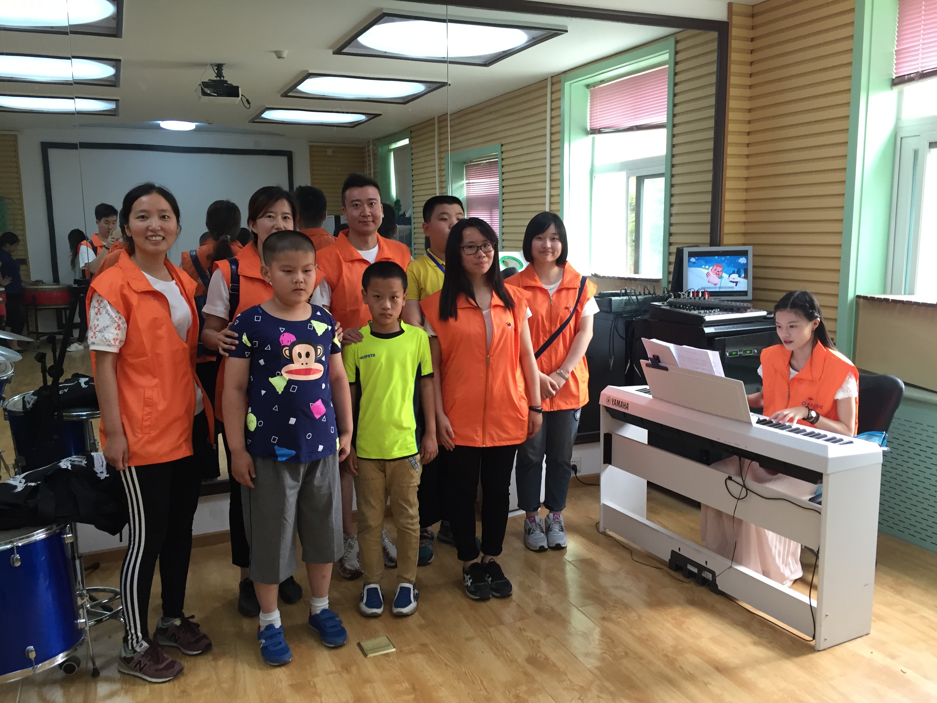 石景山培智中心学校是石景山区唯一一所为智力缺陷学生开办的九年全日制学校。在前期多次与培智学校沟通交流的基础上,支部同学已对自闭症儿童已有初步了解。整整一个上午,师生们陪伴着孩子唱歌、表演、画画、做手工、体能训练。在手工课教室里,孩子们专注、乖巧,他们任意挥洒着想象力,手中的彩泥就是表达内心世界的舞台。在美术教室里,孩子们在画纸前尽情的放飞思绪、让心灵自然地流淌,他们挥笔自如,画是那样的纯净。在音乐教室里,两位培智学校的孩子用那含糊不清的语言跟我们志愿者们一同合唱了《我爱色情片天安门》等歌曲。他们的专注、乐观、他的一举一动,让在场的每一位为之动容。很多志愿者悄悄的擦拭眼角钦佩的泪光。