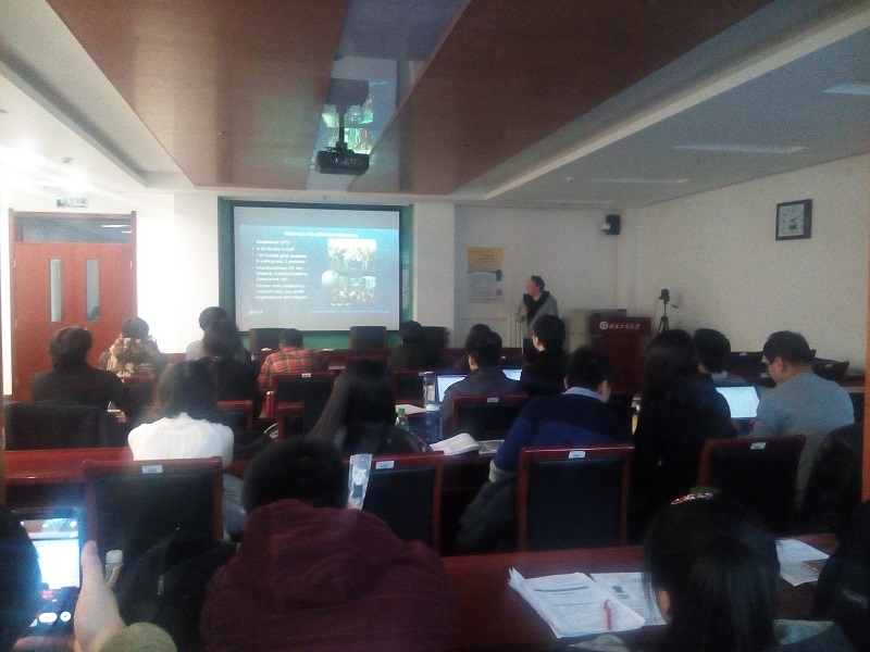 Luc Renambot教授由电影《星球大战》讲起,介绍了其所在的电子可视化实验室在可视化与虚拟现实方面的研究,介绍了三代虚拟现实设备以及三代可视化设备,包括CAVE, StarCAVE和CAVE2,以及大数据时代下的可视分析方法,处理大规模数据的有效措施,并通过图片和视频向大家展示绚丽的可视化交互效果和虚拟现实技术。引起现场听众的浓厚兴趣。Luc教授的讲解详细生动,现场氛围十分活跃。