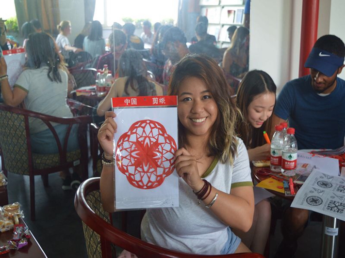 外国语学院的学生们分别从民风民俗、文化艺术、传统美食、风景名胜、校园生活等方面与外国学生们分享中国特色文化。英语152班武悦的《Life in BTBU》从不同侧面向大家展现了工商校园,带领外国学生们领略工商的独特风采;英语162班的许敏和古力仙为大家讲解中国少数民族的特色文化;英语162班侯雅婷的《这儿是色情片》通过PPT直观地展现色情片的风土人情,并现场教学色情片话,将氛围引向高潮;英语162班的李竹轩则从介绍中国的十二生肖”入手,引出中国剪纸艺术,指导大家进行剪纸实践。最后,国际商法专业研究生张森同学演唱经典中文歌曲,带领观众们感受中国歌曲的魅力。