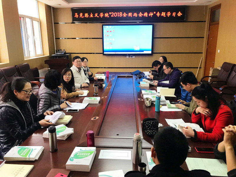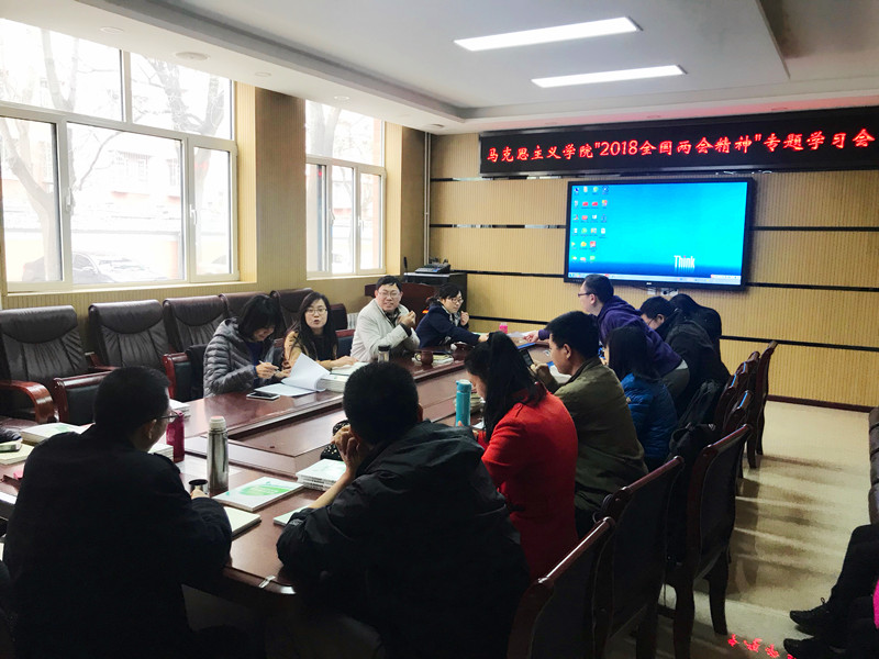 为深入学习领会2018年全国两会精神,4月4日下午,马克思主义学院党总支在阜成路校区组织召开“2018全国两会精神”专题学习会。会议由马克思主义学院院长兼党总支书记王鲁娜主持,学院全体教师党员参加了会议。