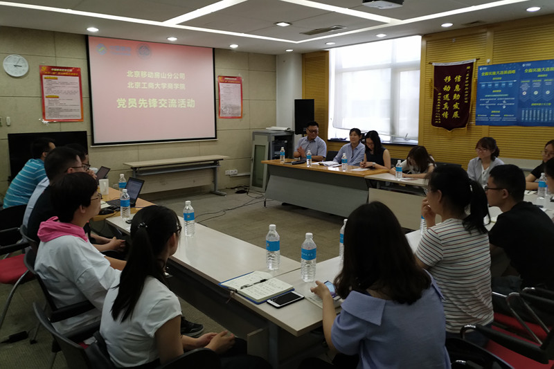 5月31日下午,商学院党委副书记樊江涛、营销系党员教师洪莹、团委书记李艳春及十余名学生党员赴中国移动房山分公司开展红色“1+1”共建活动。房山分公司副总经理杨翌昀、市场部经理郝鹏、党支部书记姜恒、房山分公司党员代表及房山区体育局、统计局等7个委办局相关领导参加了此次活动。