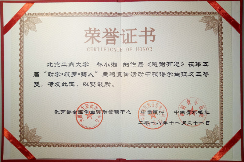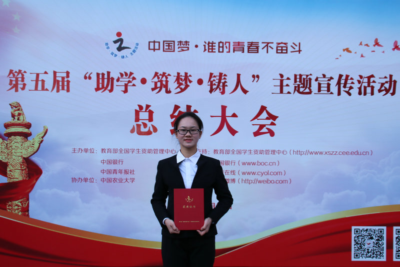 11月21日,第五届“助学·筑梦·铸人”主题宣传活动总结大会在中国农业大学举行。我校法学院法学172班林小湘同学荣获学生征文三等奖。