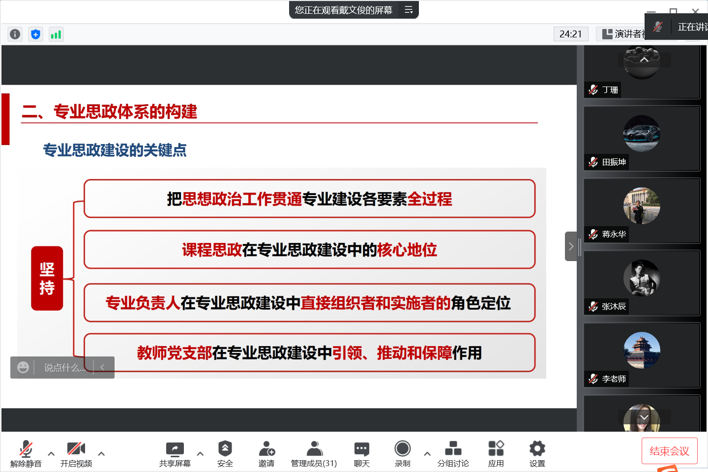 戴文俊以《艺术专业课程思政元素的内涵挖掘与创新设计》为题,围绕课程思政的源起,专业思政体系构建、课程思政示范课程建设和课程思政教学设计案例等四个方面进行讲授。重点讲授了课程思政的内容、专业思政的关键点、课程思政示范课体系建设,以所授的国画技法课程为例,展示了课程思政示范课程建设过程与取得的成绩,提出了专业课程应具备挖掘课程思政元素、有机融入课堂教学和教育者先受教育的三项基本功,应遵循治学的态度、思考的角度、教授的温度、教学的维度以及课程的粘度等五度原则。