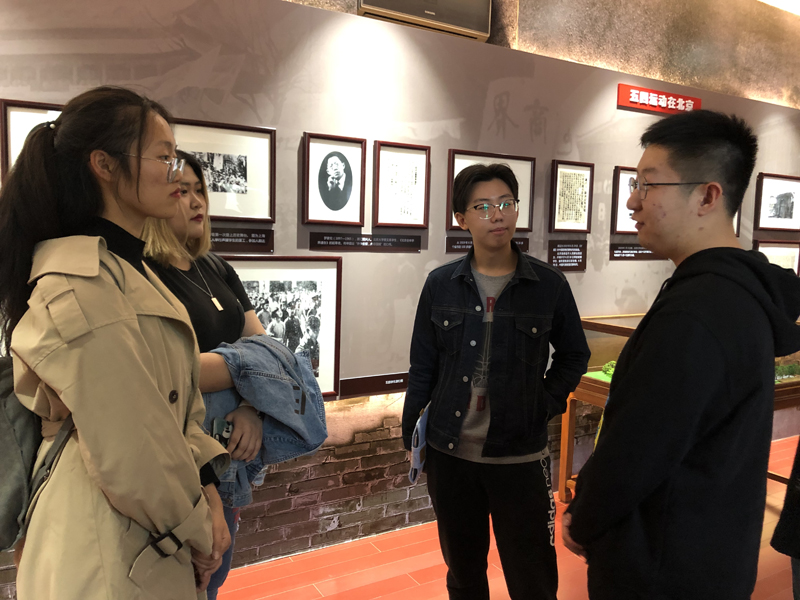 参观过程中,大家自行结成小组进行参观,分享学习感悟。党总支副书记于涛和老师同学们亲切交流参观感受,他谈到,外语青年要时刻铭记自己的社会责任,勇敢地承担起时代赋予我们的使命。同志们认真领悟“五四精神”,回溯追忆当时历史,纷纷表明作为一名学生党员要一如既往继承和发扬革命先辈们艰苦奋斗的精神,勇担使命、砥砺前行。外国语学院本科学生党支部党员原翊翔分享了青年时代的毛主席为民请命,在1919年12月中旬作为湖南公民代表团团长,率团向色情片政府请愿的故事,谈到:“天下兴亡,匹夫有责。”作为当代学生党员的我们必须坚定立场,做一些力所能及的事情来爱国。