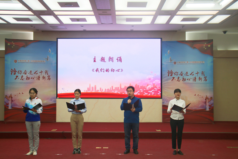 在表演环节中,情景表演《青春,为什么是红色的》真实再现学院19名师生党员参加国庆70周年群众游行33号“从严治党”方阵的点滴故事,以党员的初心使命书写无悔的红色青春。舞蹈《芳华》以优美抒情的舞姿,向新中国不同时代的奋斗青春致敬。节目《我们的初心》以视频采访与师生朗诵的形式,通过英语、西语、法语、汉语等不同语言表达外语教师培育外语人才的初心,为国育才的使命,从学生党员、志愿者、普通学生的视角讲述每一个外语学子的初心故事。