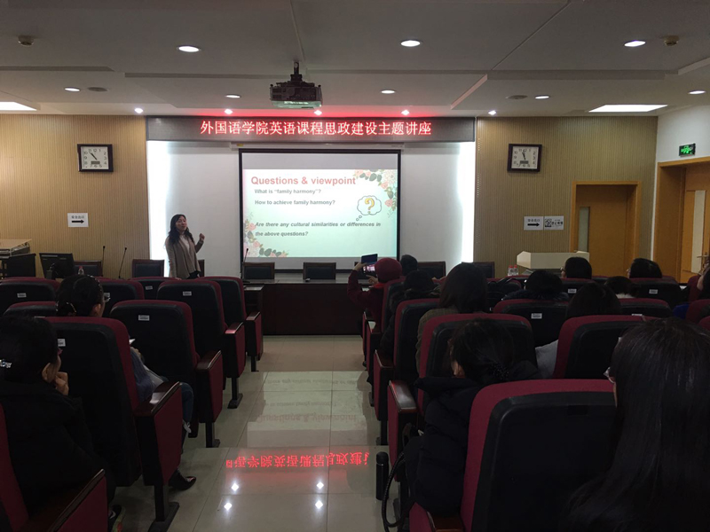 李丹丹以她参加的一次《大学英语》课程思政教学设计为案例《Family Harmony》,展示了如何把中国文化家庭价值观无痕融入教学,激发学生思考与讨论,“家是最小国,国是千万家(Home is the smallest country, and the country is tens of millions.)” ,家庭和睦则社会安定,家庭幸福则社会祥和,家庭文明则社会文明,把爱家和爱国统一起来,提升学生中国文化归属感和自信感。