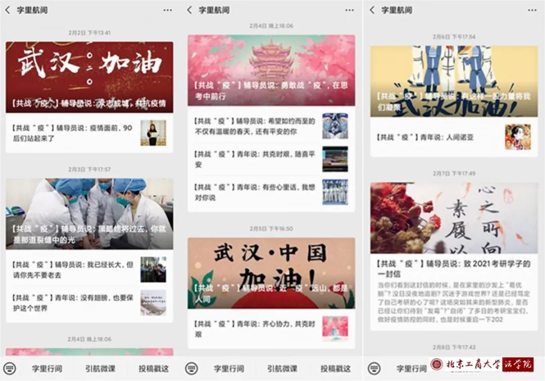 辅导员尹航依托“字里航间”辅导员网络思政工作室,发布 “辅导员说”、“青年说”原创文章25篇,提醒学生们强防护、不恐慌、信科学、不传谣,将防疫与思政育人相结合,并于公众号中推出“共战疫”系列活动,以散文,诗歌,海报等形式为疫情发声。引导学生坚定理想信念,担当抗“疫”宣传员。