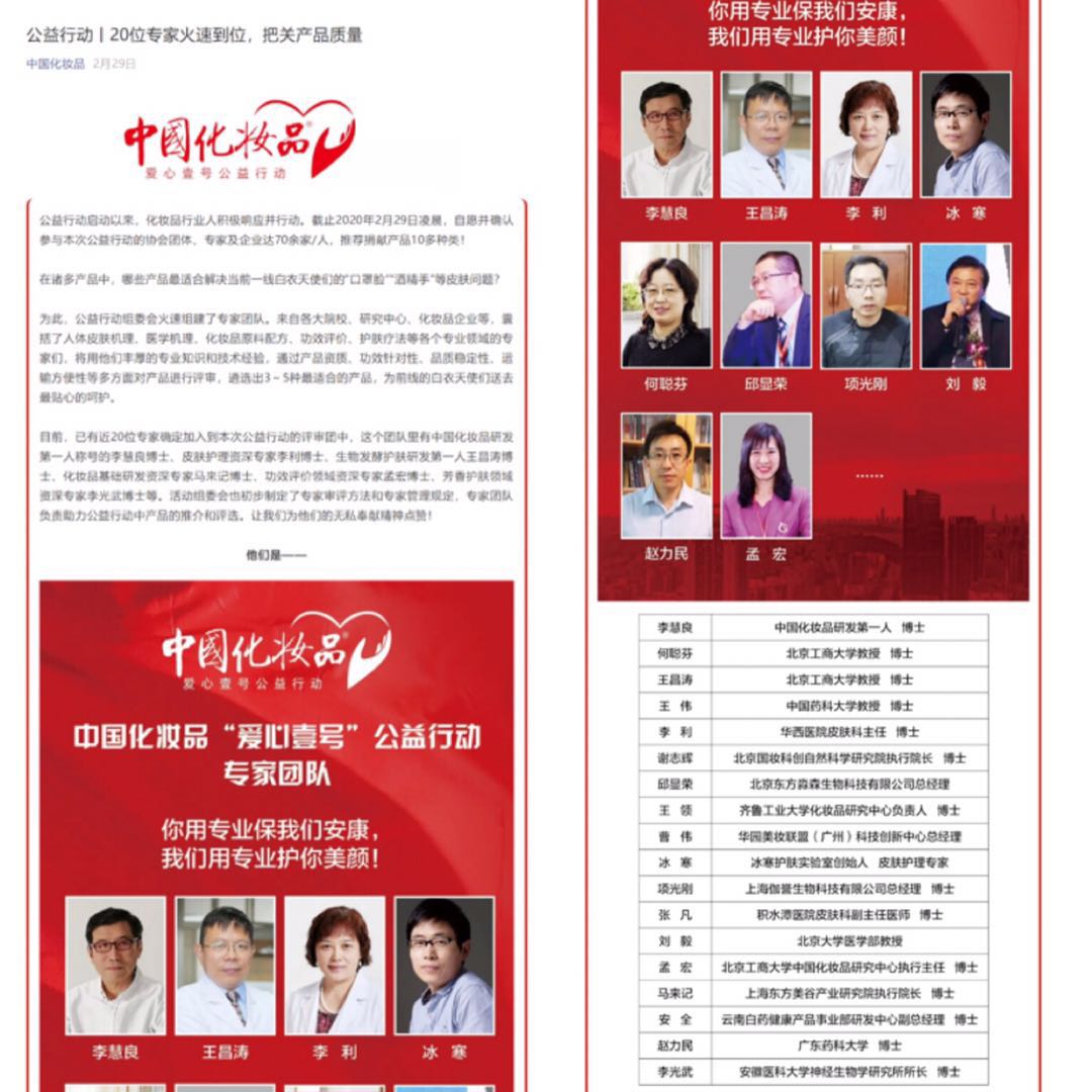 2020年2月25日,为积极贯彻和落实习近平总书记就关心爱护参与疫情防控工作的医务人员的重要指示,由《中国化妆品》杂志社牵头启动“致敬最美白衣天使·中国化妆品‘爱心壹号’公益行动”,我校理学院化妆品系教授何聪芬、孟宏、王昌涛、贾焱加入本次公益行动组委会专家团队,作为业界专家助力公益行动中优质产品的评选。