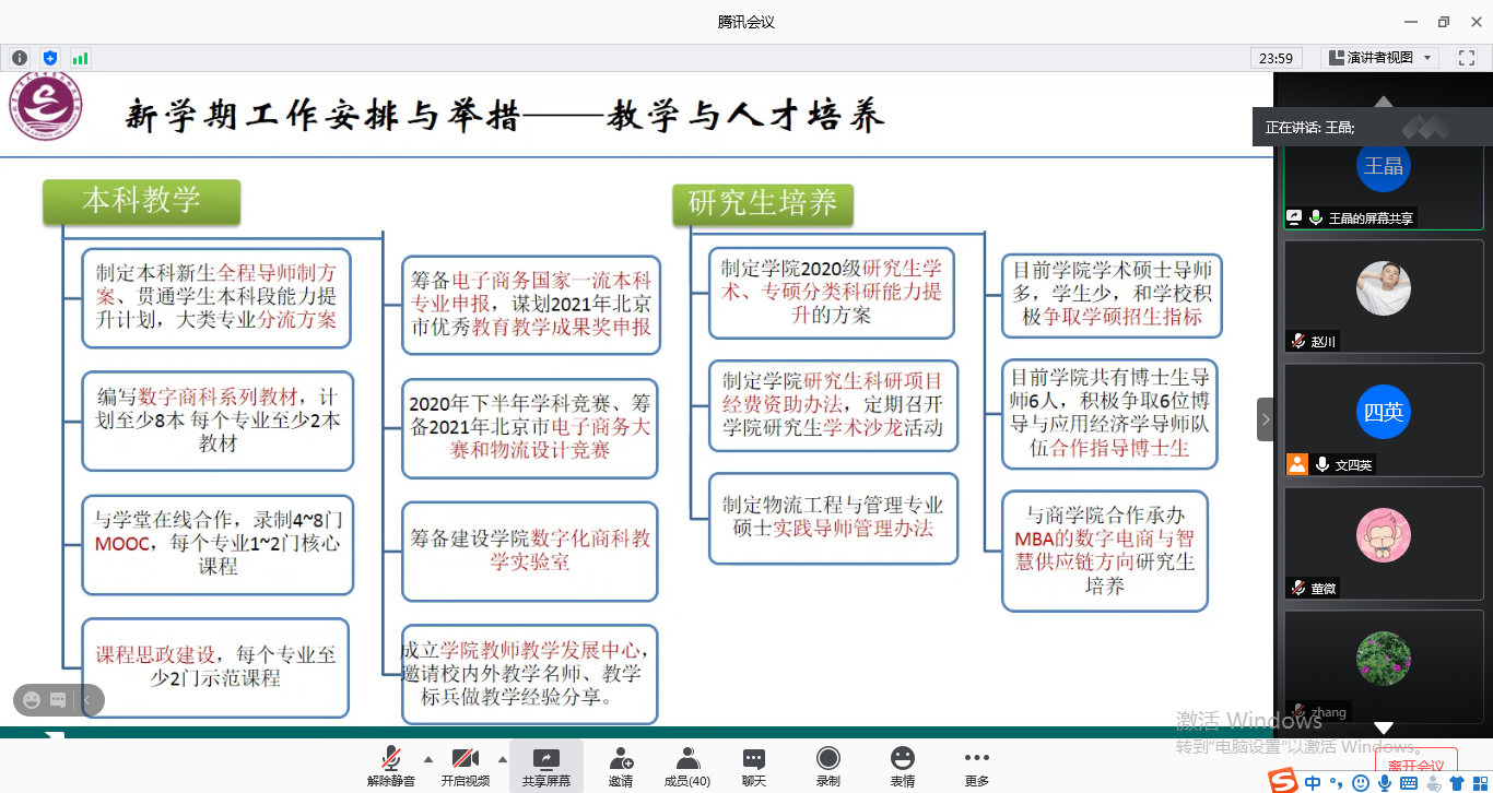 副院长王晶就分管的本科生和研究生工作进行了总结,上半年学院圆满完成抗击疫情期间的线上教学任务,修订学院四个本科、三个研究生专业的培养方案修订,在学校教学名师标兵、教改立项、学科竞赛等方面取得了优异的成绩,成功举办了研究生夏令营活动。详细布置了下半年的工作,下半年学院将围绕学校重点工作积极准备电子商务一流本科专业申报,制定学院本科生全程导师制方案,筹备数字商科系列教材,推进精品课程MOOC建设、加强研究生创新能力培养等相关工作,全面提升本科与研究生培养的质量。