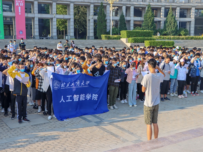 9月22日清晨,学院在良乡校区求知广场举行了2020级本科新生的开课仪式。院长于重重、新生辅导员胡洋出席仪式。电信类201班王羽凝主持仪式。全体新生集体朗诵《少年中国说》,由新生代表电信202班张艺彤领诵。同学们铿锵有力,高亢激昂的声音响彻整个广场,充分展现出中国少年的英姿。于重重院长做开课动员讲话,以电气专业17级学姐吴京鸿为例鼓励新生们努力学习,吴京鸿以总绩点4.7、全校第一的总评分顺利获评国家奖学金。于院长鼓励新生们要理论和实践相结合,她强调实践出真知,只有实践才能增强理解、运用所学知识解决实际问题的能力,从实践当中感受学习的乐趣,并掌握知识的重要内容,做到高效与快乐地学习。同学们认真聆听,深表赞同。最后由新生代表张艺彤带领全体同学庄严宣誓。每一位学生手中紧握着宣誓词,庄重严肃进行宣誓,承诺课前不迟到、课上要认真、下课不早退、争做自律人,用饱满的热情与信心,面对当下与未来。宣誓结尾各位新生大声喊出自己的姓名,期望明日的北工商为自己骄傲与自豪。