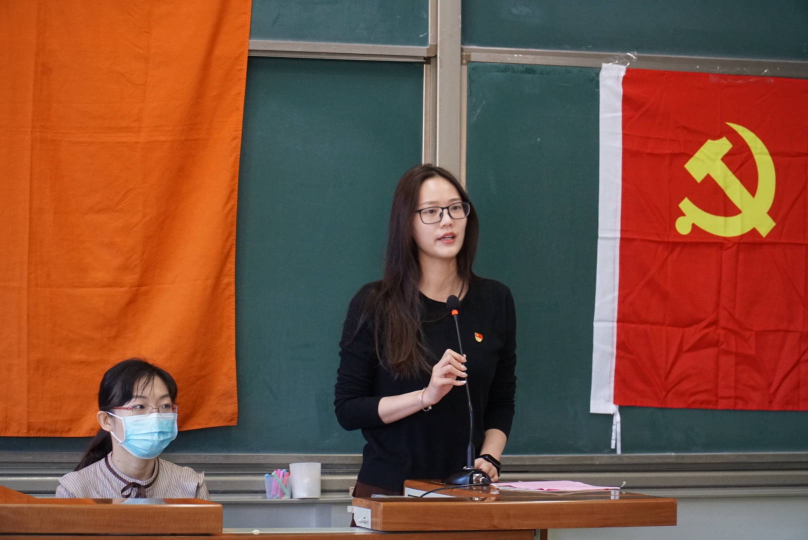 来自法学173班的党员武晶晶结合自己的入党经历,以本科时期参与学生工作的感悟为切口,向同学们分享了自己的心路历程。她表示,可以在这个时代入党,她感到十分幸运与自豪。同时,她呼吁同学们加入共产党,拥有一个有信仰、有梦想、有奉献的人生。