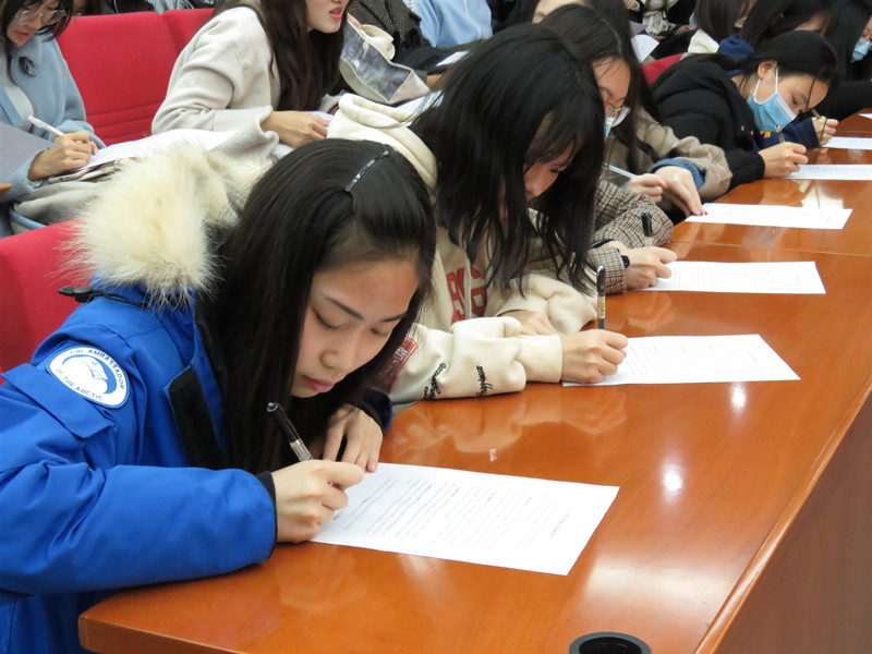会上,经济学院辅导员路京明宣读《关于2020年度经济学院党员宿舍和党员床位挂牌的决定》。各位党员在“学生党员联系宿舍承诺书”上签字,承诺充分发挥学生党员的先锋模范作用。马灵清代表我院学生党员发言,她表示要坚定共产主义理想信念;明确自身职责,加强服务群众的能力;做表率,树先锋,用实际行动擦亮党员先锋底色。向小平和尹皓霙倢两位老师向各支部学生党员代表发放党员宿舍挂牌。各位党员、预备党员重温入党誓词,一句句铮铮誓言,表达了自己不忘初心跟党走的决心。