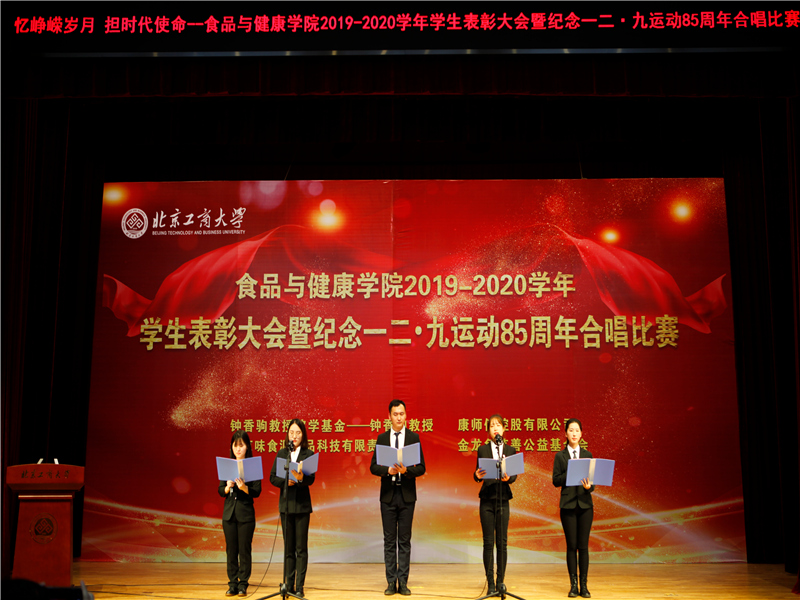 为纪念“一二·九”运动85周年,引导激励学生继承和弘扬爱国主义精神,深入学习贯彻习近平新时代中国特色社会主义思想,树立责任意识,争做先进优秀,增强集体凝聚力和荣誉感,12月17日,食品与健康学院在阜成路校区举办了“忆峥嵘岁月 担时代使命”2019—2020学年学生表彰大会暨纪念“一二·九”运动85周年合唱比赛。