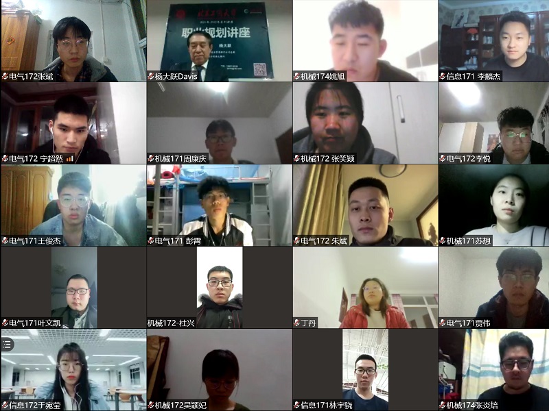 随着就业市场竞争越来越激烈,职业生涯规划越来越受到高校和大学生们的重视,为帮助同学们了解职业生涯规划的重要性,人工智能学院邀请知名校友杨大跃作职业生涯规划系列讲座,3月16日和3月19日晚,杨大跃通过线上讲座的方式,为人工智能学院的同学们作《迈向职业生涯成功的起点》初级和中级班讲座。