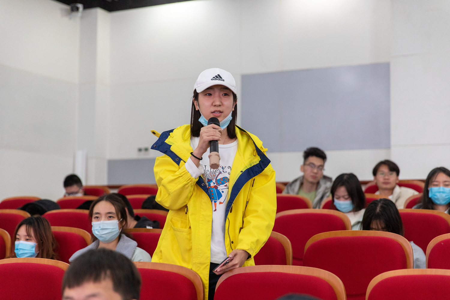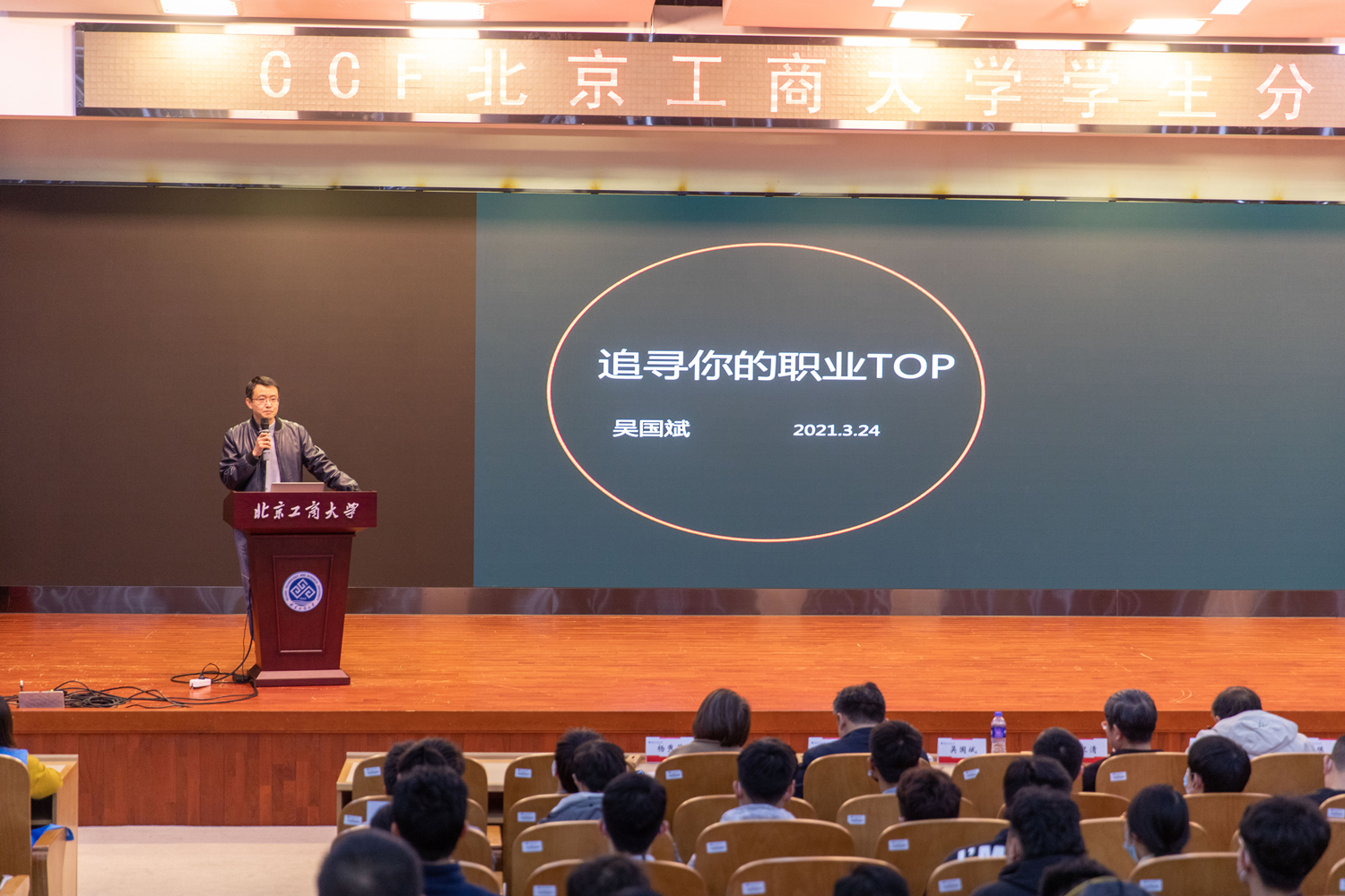 吴国斌作了题为“寻找你职业的TOP”的报告。他为大家分享了他从学生转变为职场人12年的经历和思考。他谈到,从2013年在微软公司做项目时,他就明确了自己未来的方向,他为同学们讲述自己践行梦想的经历和感悟。他还通过视频展现了在疫情期间,他与滴滴研发团队用科技力量参与抗疫行动的事迹。并表示会继续努力通过技术创新帮助更多社会上需要帮助的人们。他谈到,寻找理想的职业需要热爱与天赋,希望同学们将来能从事自身有天赋并且发自内心热爱的工作,才能有机会登上职业生涯的顶峰。随后,学生们与吴国斌进行了交流互动。