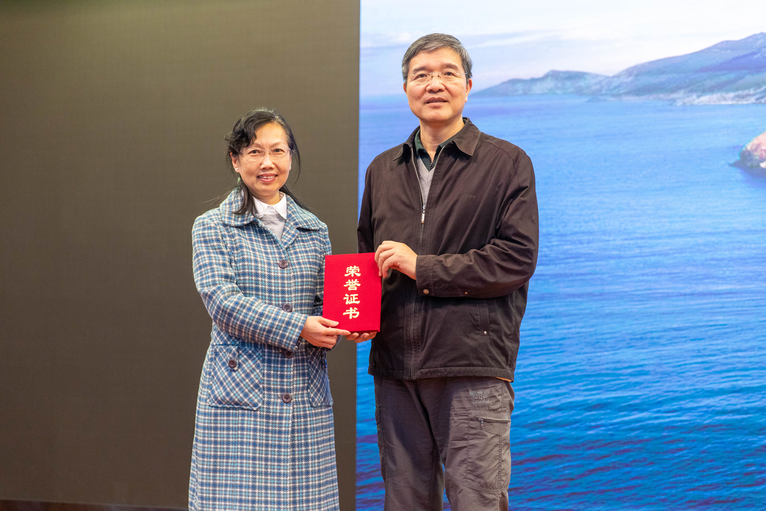 报告结束后,陈谊和谭励在热烈的掌声中代表学院为唐卫清和吴国斌颁发了荣誉证书。