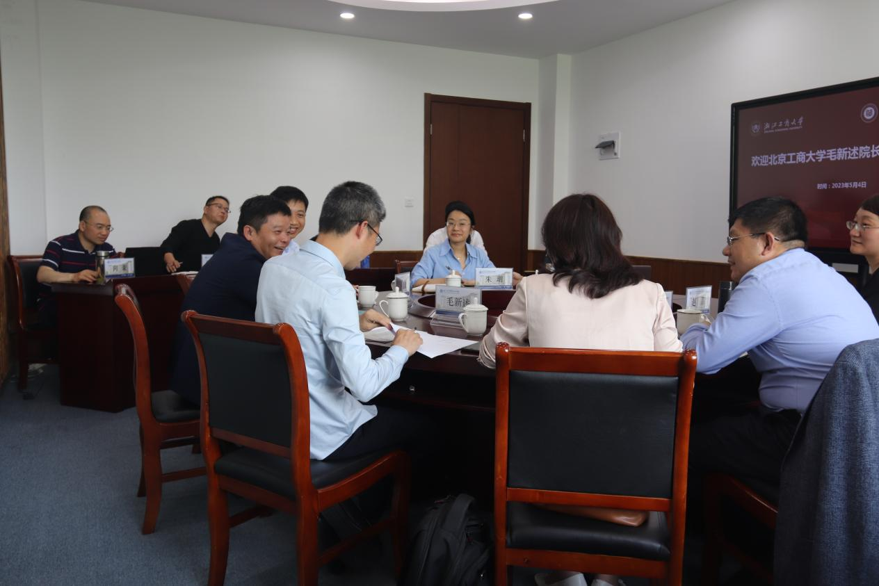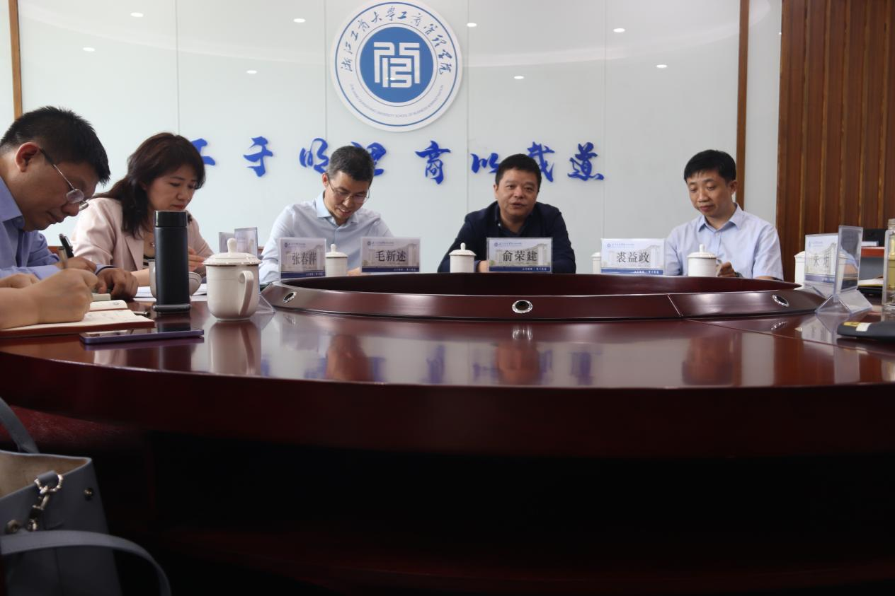 在浙江工商大学工商管理学院,党委书记孙元、院长俞荣建、副院长朱玥、岑杰和会计学院党委书记裘益政等参加了交流座谈,详细介绍了学院学科专业特色与博士点建设、党建与业务深度融合的情况、数字化转型的举措以及人才引进情况、学院研究中心的设置与科研推进等情况,双方就商科数字化转型、师资队伍建设、商科国际认证、专硕招生与研究生培养、校友工作的拓展等进行了深度交流。