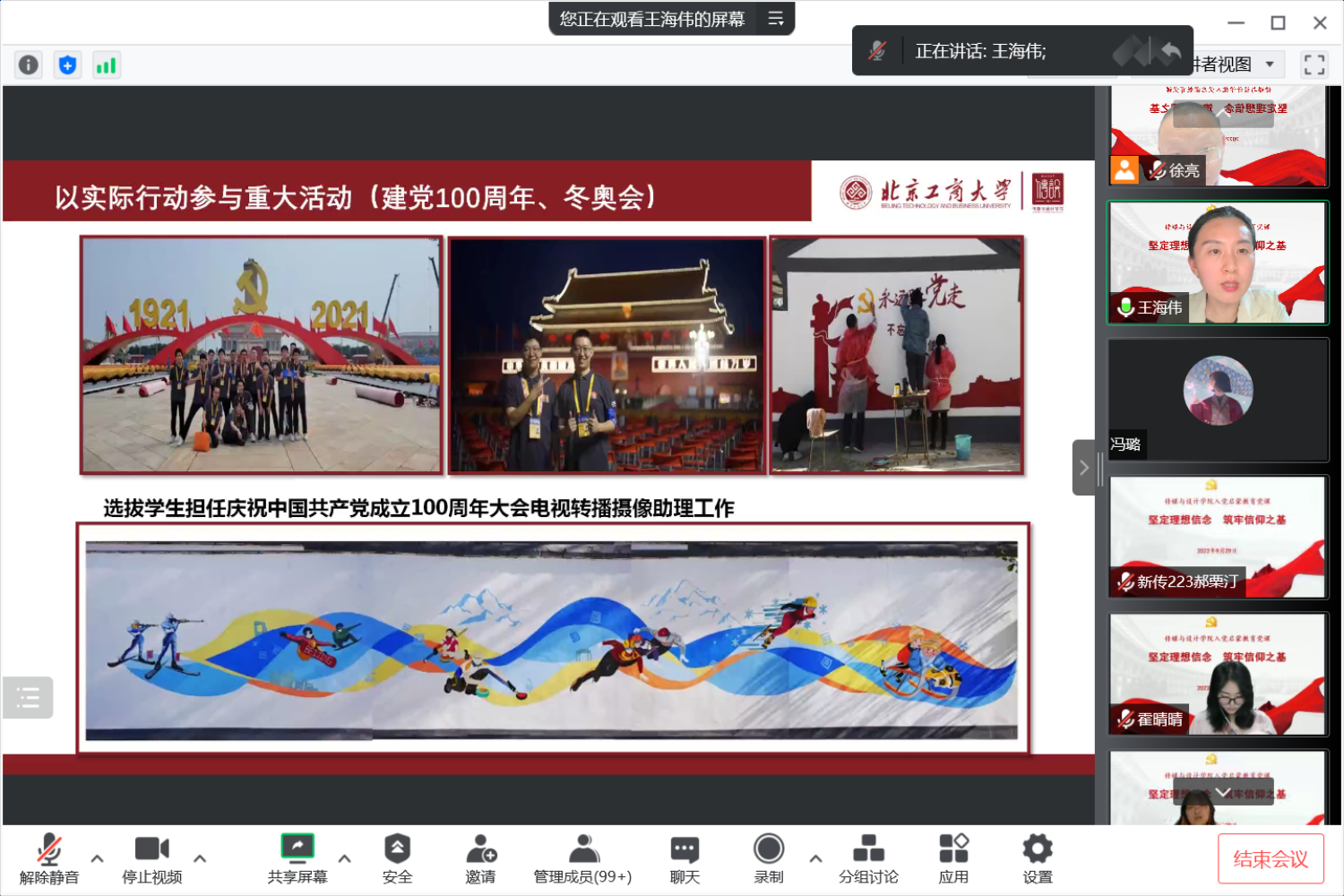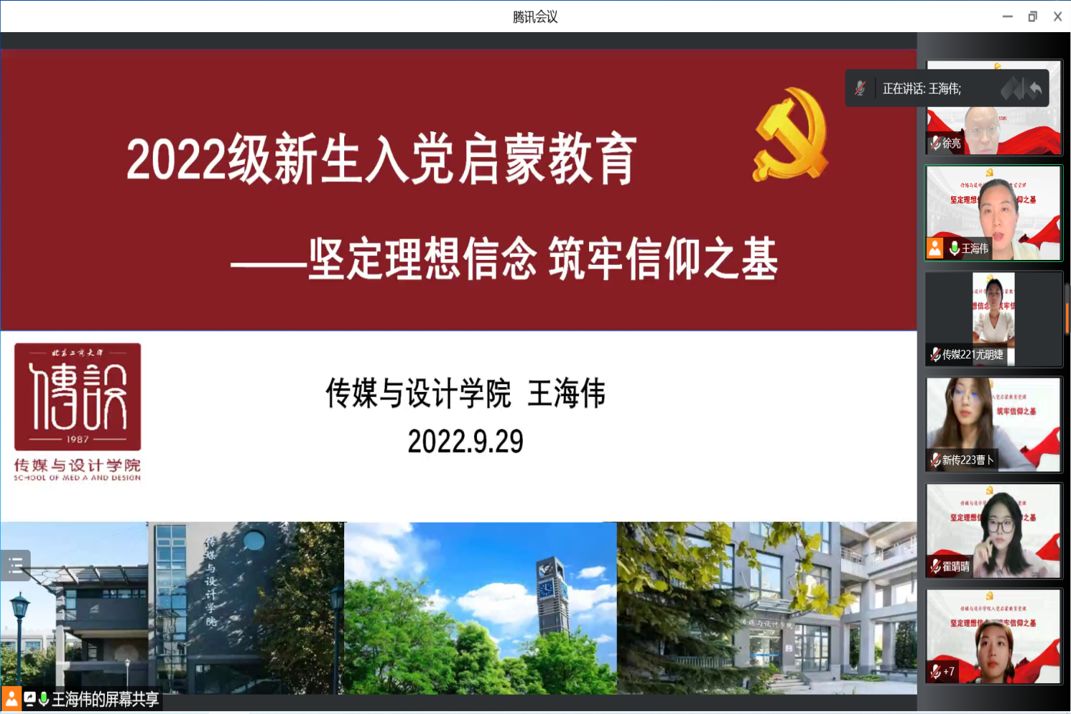 青春心向党,信仰正启航。为切实做好传媒与设计学院2022级新生入党启蒙教育工作,引导新生知党史、强信仰,端正入党动机,坚定理想信念。9月29日晚,传媒与设计学院于线上开展新生入党启蒙教育专题党课,学院全体本科生与研究生新生400余人参加党课学习,党课由学院党委书记王海伟讲授,专职组织员徐亮主持。