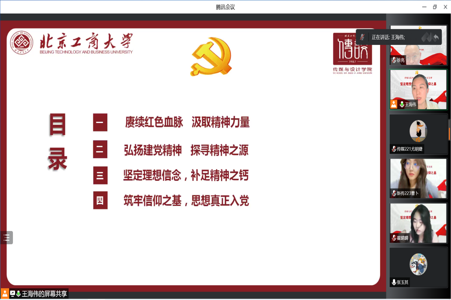 党课围绕赓续红色血脉、弘扬建党精神、坚定理想信念、筑牢信仰之基四个方面展开。王海伟以习近平总书记在庆祝中国共产党成立100周年大会上的重要讲话引出共产党人的精神长河和精神高地,通过带领同学们重新学习雷锋同志和当代雷锋郭明义同志的先进事迹,指出精神力量具有传承性,以电影《我和我的祖国》中钱学森同志的故事指出精神力量具有引领性,长征精神、抗疫精神彰显出精神力量具有聚合性,引导同学们从伟大精神中汲取奋进力量。王海伟带领同学们回顾了党史一百年发展历程中的四次伟大飞跃。通过讲述伟大建党精神的背景,深刻阐述了马克思主义赋予了其明确的革命基调,伟大建党活动赋予了其厚重的实践。结合杨靖宇同志、焦裕禄同志、抗美援朝等典型案例阐述课伟大建党精神的科学内涵,教育同学们不忘来时路,常怀感恩心。