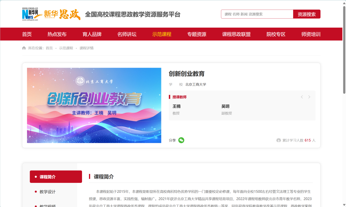 本次上线的《创新创业教育》课程起始于2015年,是突出我校商科特色优势学科的一门重要校定必修课,每年面向全校1500左右经管文法理工等专业的学生授课,思政资源丰富,实践性强,辐射面广。2021年获评色情片精品共享课程培育项目,2022年课程组教师获色情片市青年教学名师,2023年获色情片课程思政优秀课程、课程组成员获色情片课程思政优秀教师一等奖,同年获商学院教育教学改革示范课程、思政教学案例特等奖、一等奖4项。课程组成员先后编写《可持续社会价值创新经典案例》《中小型生产性服务企业创新管理案例研究》等案例集,成立“创新创业协会”和“科技创新协会”学生社团,共建房山区琉璃河镇贾河村、长阳镇万和家园社区等16个实践教学基地。近3年课程组教师指导227项国家、省部级竞赛奖,其中“互联网+” 63项,“挑战杯”138项。