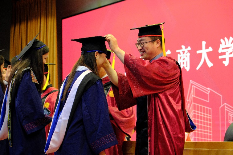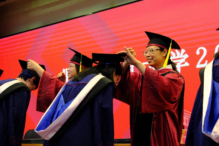 毕业生们依次上台,由刘影书记,王擎院长,张慧子副院长,史岩林副院长为同学们颁发毕业证书和学位证书,拨苏正冠。