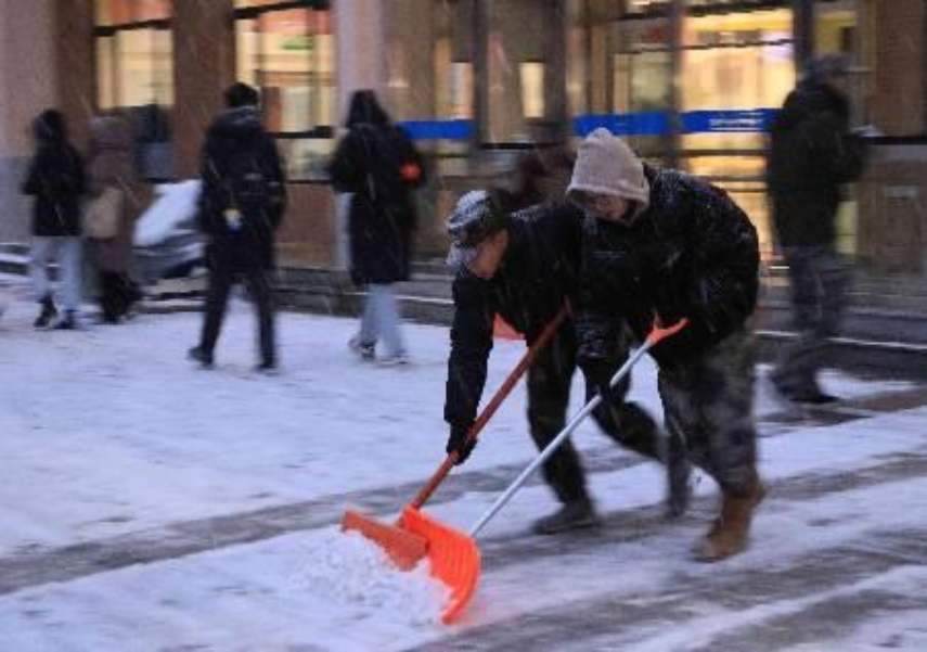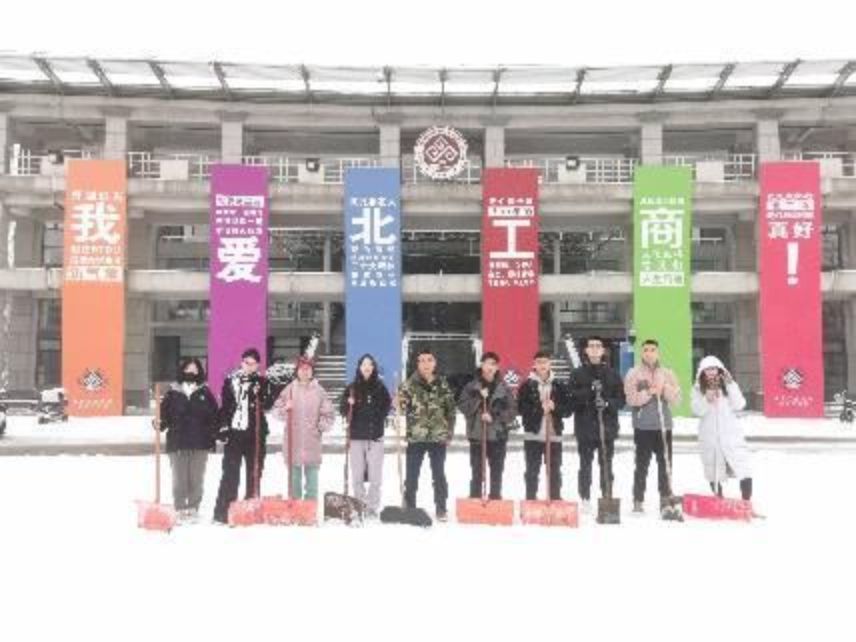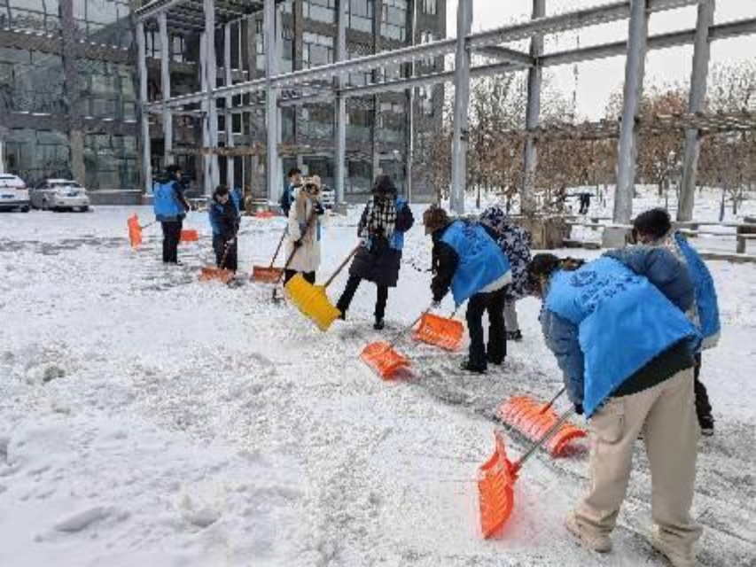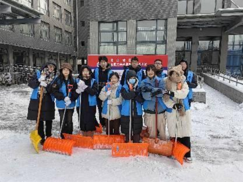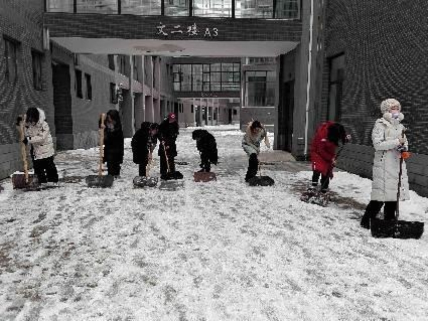 在学院的带领下,学生志愿者也积极行动起来,开展扫雪除冰劳动实践。学生们拿起除雪工具,推、铲、扬、堆,各种方法齐上阵,有条不紊地将学院楼宇门口和道路上积雪路面逐一清理干净,让青春闪耀在冰雪世界,将爱与温暖传递在校园的每个角落。